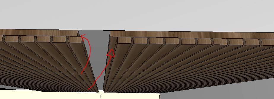 Veja na imagem acima como seria o encaixe para unir um ao outro, o painel da esquerda tem uma ripa que passa 10 mm já o da direita o fundo passa 16 mm e unindo um ao outro fica um friso de